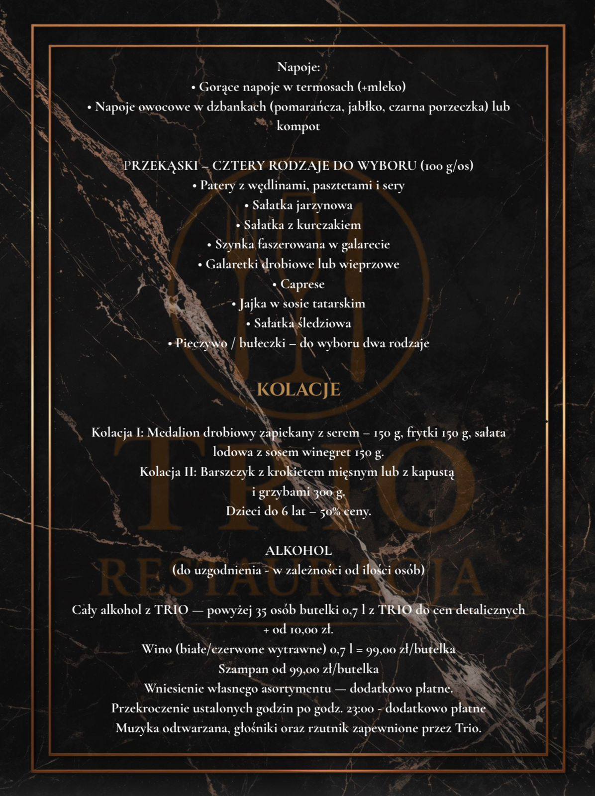 Muzyka, głośniki, rzutnik - zapewnione przez TRIO. Wniesienie własnego asortymentu lub przekroczenie godzin - dodatkowo płatne.