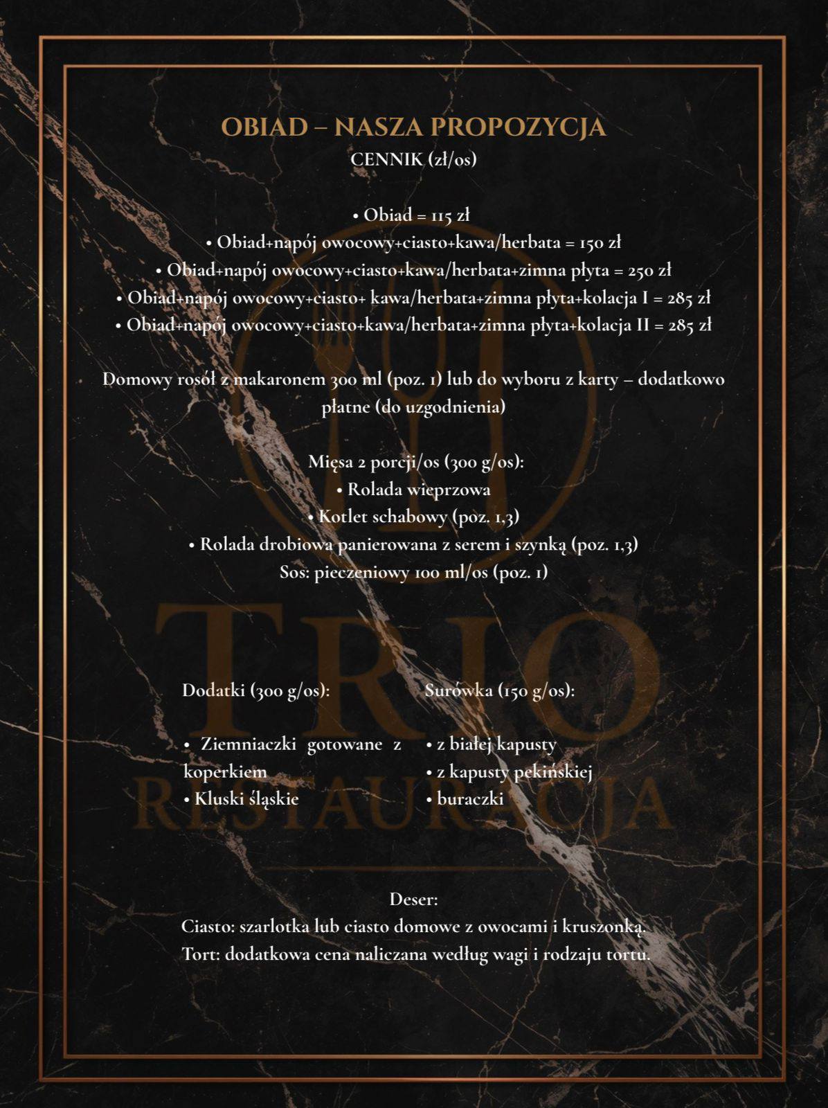 Deser: Ciasto: szarlotka lub ciasto domowe z owocami i kruszonką. Tort: dodatkowa cena naliczana według wagi i rodzaju tortu.